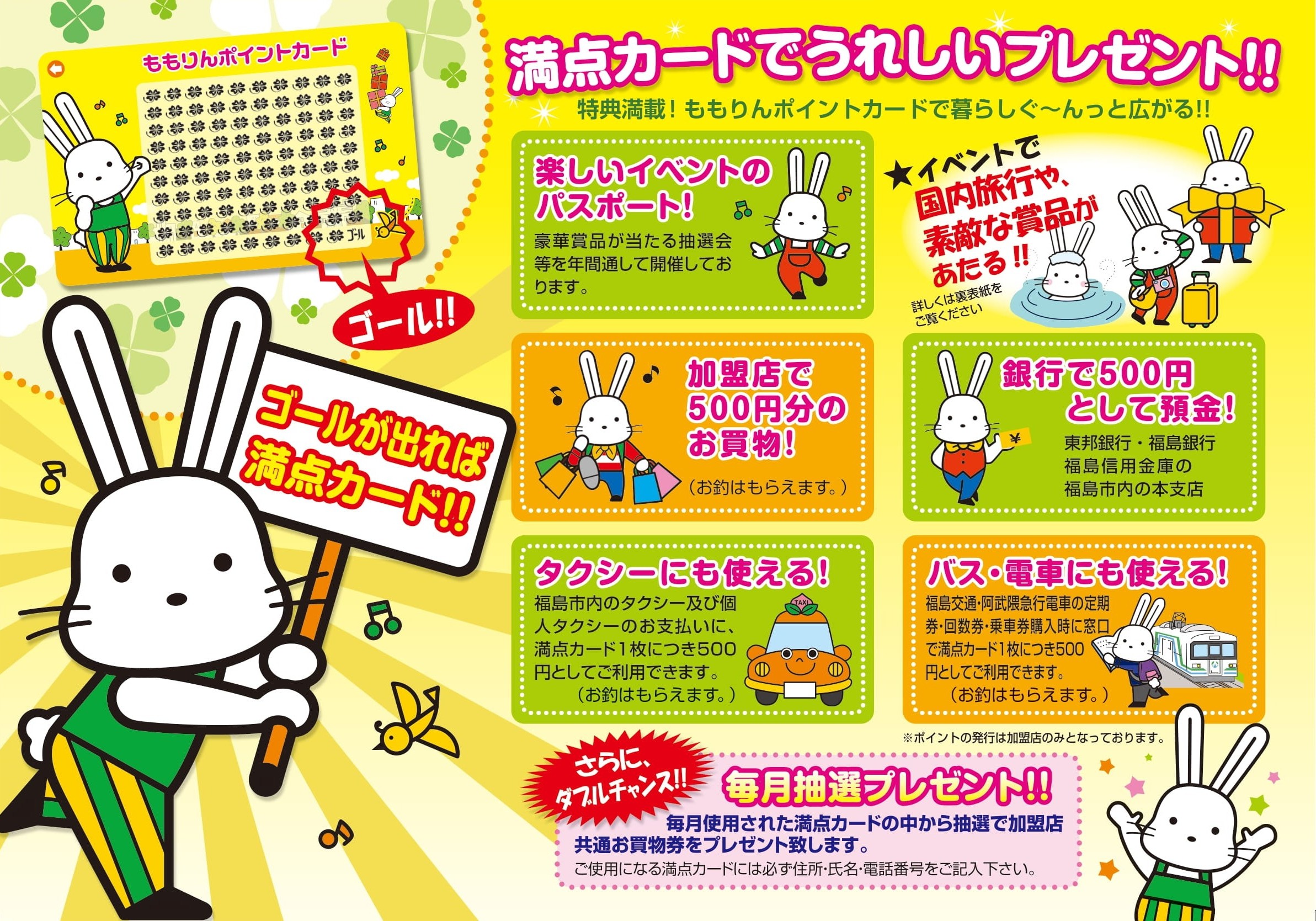 ももりんポイント加盟店で100円のお買物につき、1ポイントが貯まります。通常のももりんポイントカードは400点でゴール、ももりんポイントカード for Studentsは120点でゴールです!ももりんポイントカード for Studentsに関する詳しい情報はこちらをご確認ください。